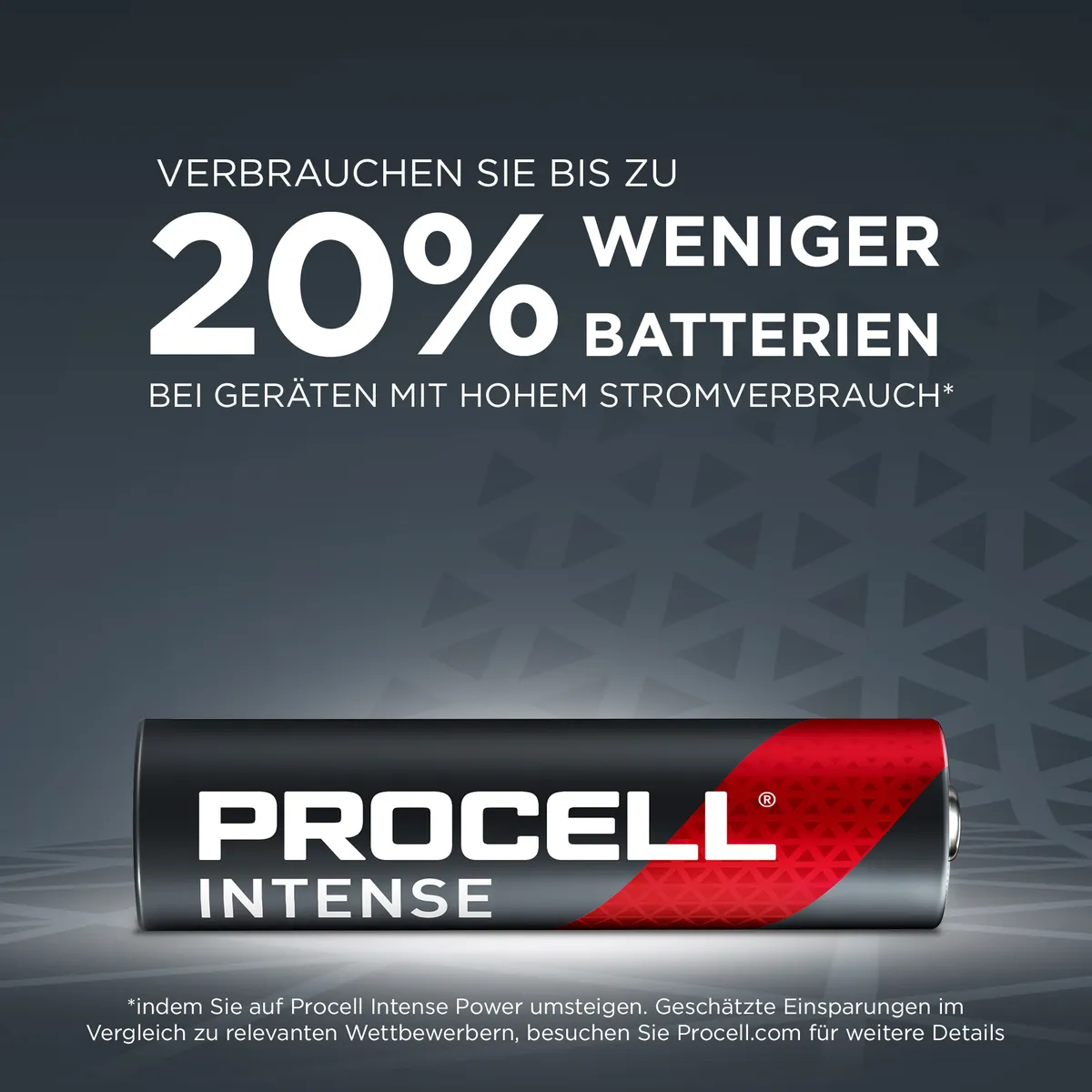 Sparen Sie in Ihrem Unternehmen bis zu 20 % durch die Umstellung auf ein duales Procell Portfolio – Procell Constant für Geräte mit geringem Stromverbrauch und Procell Intense für Geräte mit hohem Stromverbrauch (geschätzte Einsparungen im Vergleich zu relevanten Wettbewerbern)