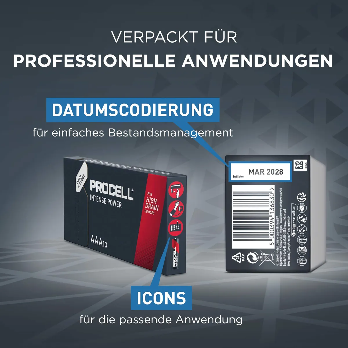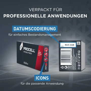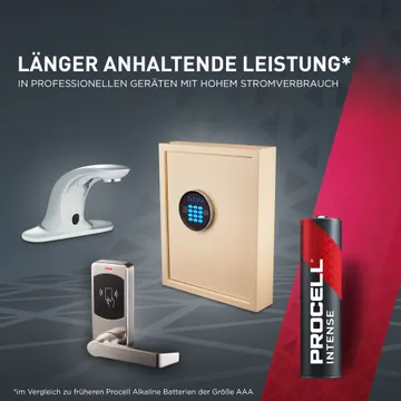 Die Procell Intense AAA-Alkaline-Industriebatterien wurden speziell für eine längere Lebensdauer (verglichen mit früheren Procell Alkaline-Batterien der Größe AAA) in professionellen Geräten mit hohem Energieverbrauch oder Leistungsspitzen entwickelt, wie z. B. Blutdruckmessgeräte, Seifenspender oder Taschenlampen.