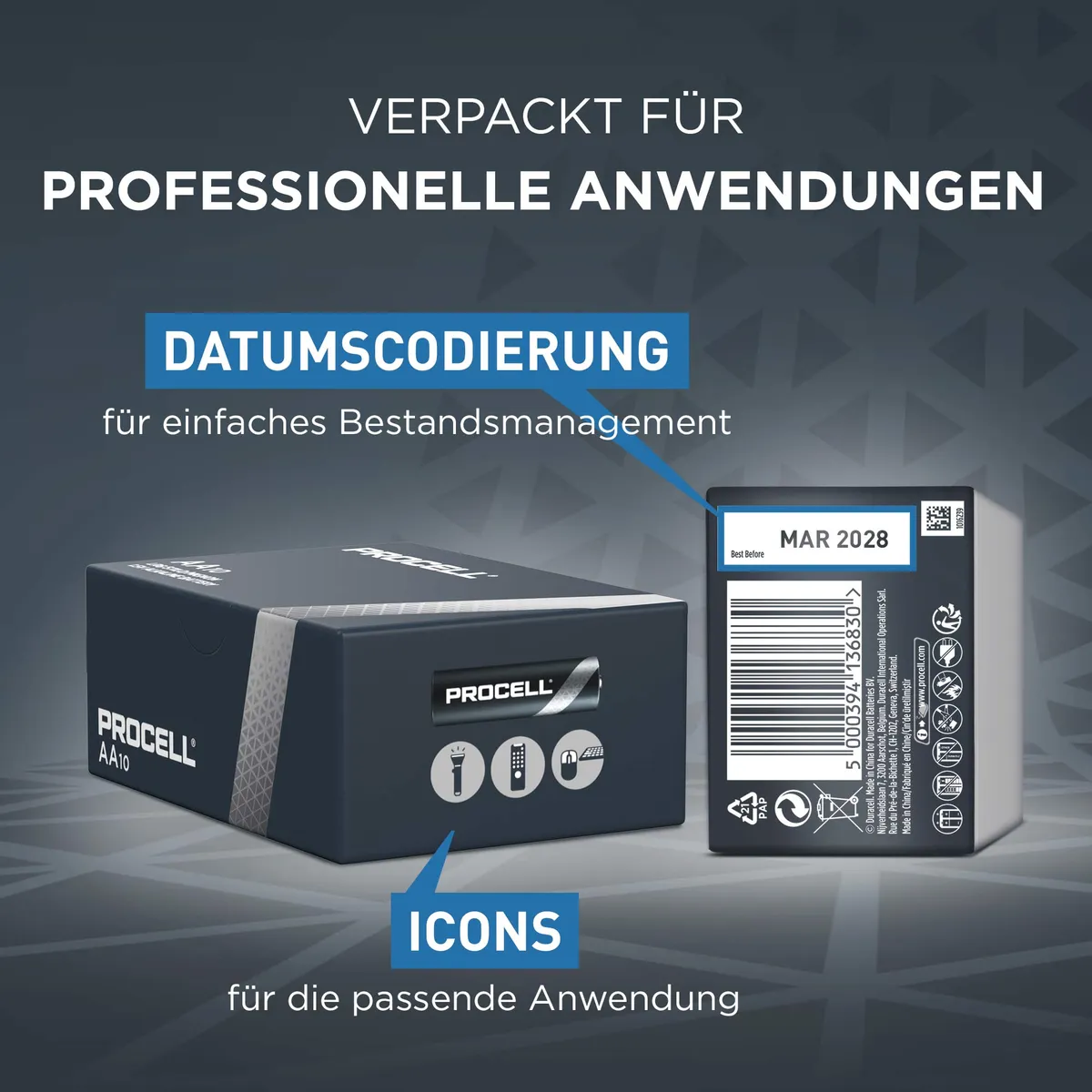 Gefertigt in einem besseren Design (verglichen mit früheren Procell Alkaline-Batterien der Größe AA), das eine qualitativ hochwertige Zellkonstruktion gewährleistet.