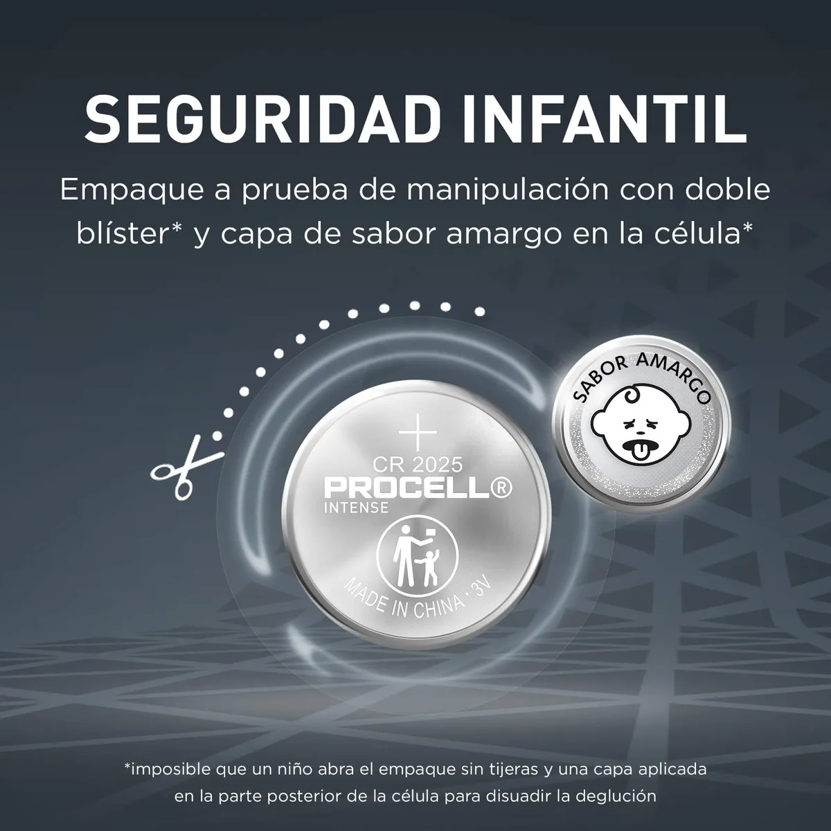 Las pilas industriales Procell Lithium Coin Intense 2025 están diseñadas para suministrar energía confiable y segura en dispositivos profesionales. Para evitar la ingestión accidental por parte de los niños, Procell ha desarrollado envases a prueba de manipulaciones con doble blíster para que sea imposible que un niño lo abra sin tijeras, y en la parte posterior de la célula se aplica una capa de sabor amargo para disuadir la ingestión.