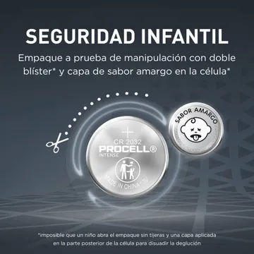 Las pilas industriales Procell Lithium Coin Intense 2032 están diseñadas para suministrar energía confiable y segura en dispositivos profesionales. Para evitar la ingestión accidental por parte de los niños, Procell ha desarrollado envases a prueba de manipulaciones con doble blíster para que sea imposible que un niño lo abra sin tijeras, y en la parte posterior de la célula se aplica una capa de sabor amargo para disuadir la ingestión.