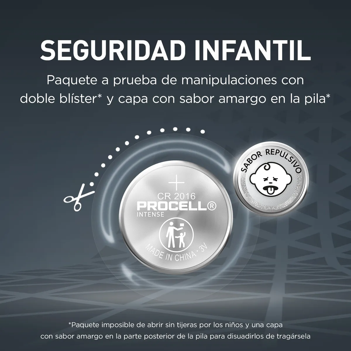 Las pilas profesionales Procell Botón de litio Intense 2016 están diseñadas para ofrecer una potencia fiable y segura en dispositivos profesionales. Para evitar la ingesta accidental por parte de los niños, Procell ha desarrollado un paquete a prueba de manipulaciones con doble blíster para que los niños no lo puedan abrir sin tijeras, así como con una capa con sabor amargo en la parte posterior de la pila para disuadirlos de tragársela.