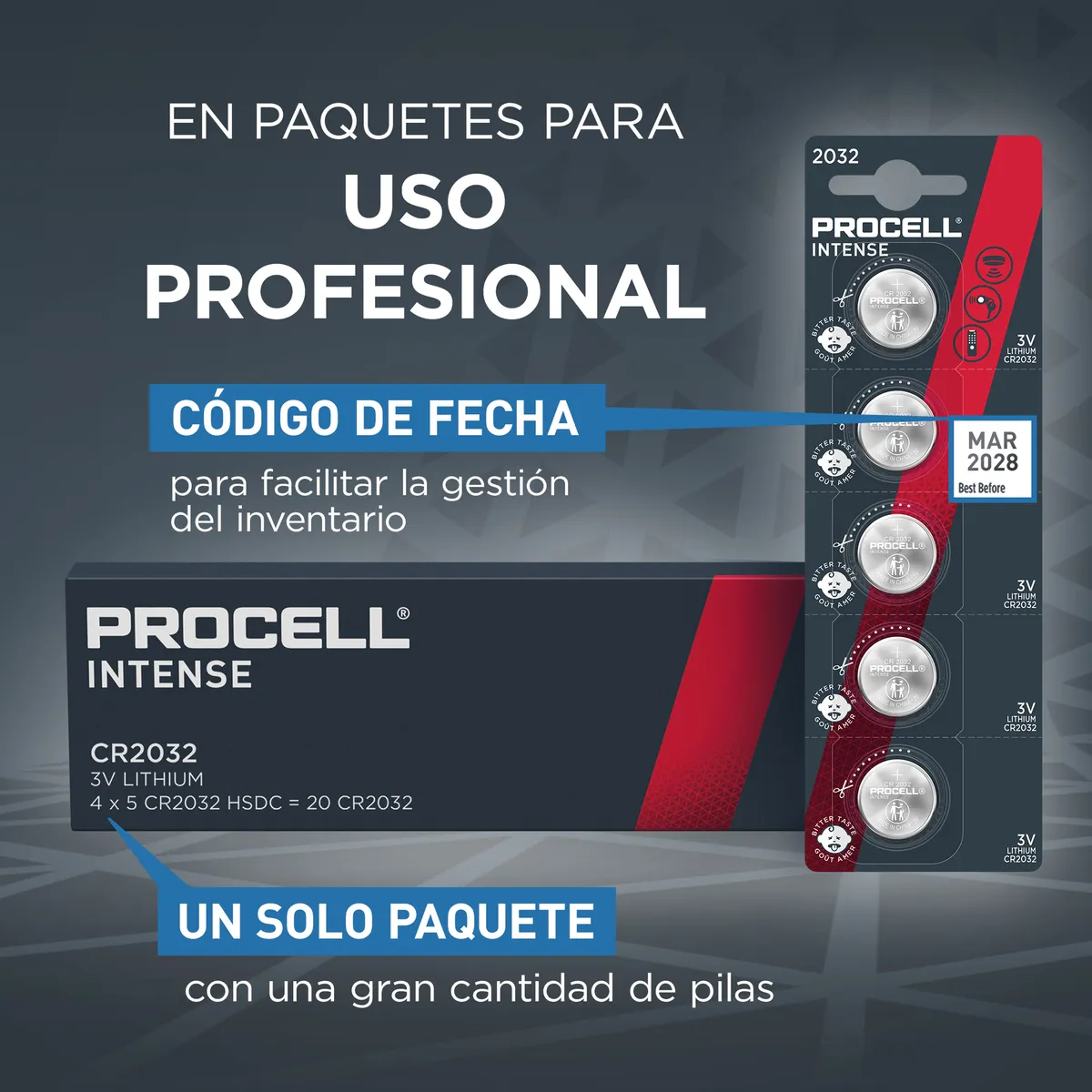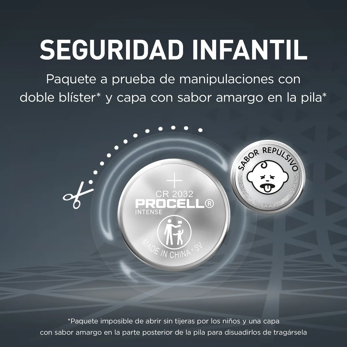 Las pilas profesionales Procell Botón de litio Intense 2032 están diseñadas para ofrecer una potencia fiable y segura en dispositivos profesionales. Para evitar la ingesta accidental por parte de los niños, Procell ha desarrollado un paquete a prueba de manipulaciones con doble blíster para que los niños no lo puedan abrir sin tijeras, así como con una capa con sabor amargo en la parte posterior de la pila para disuadirlos de tragársela.