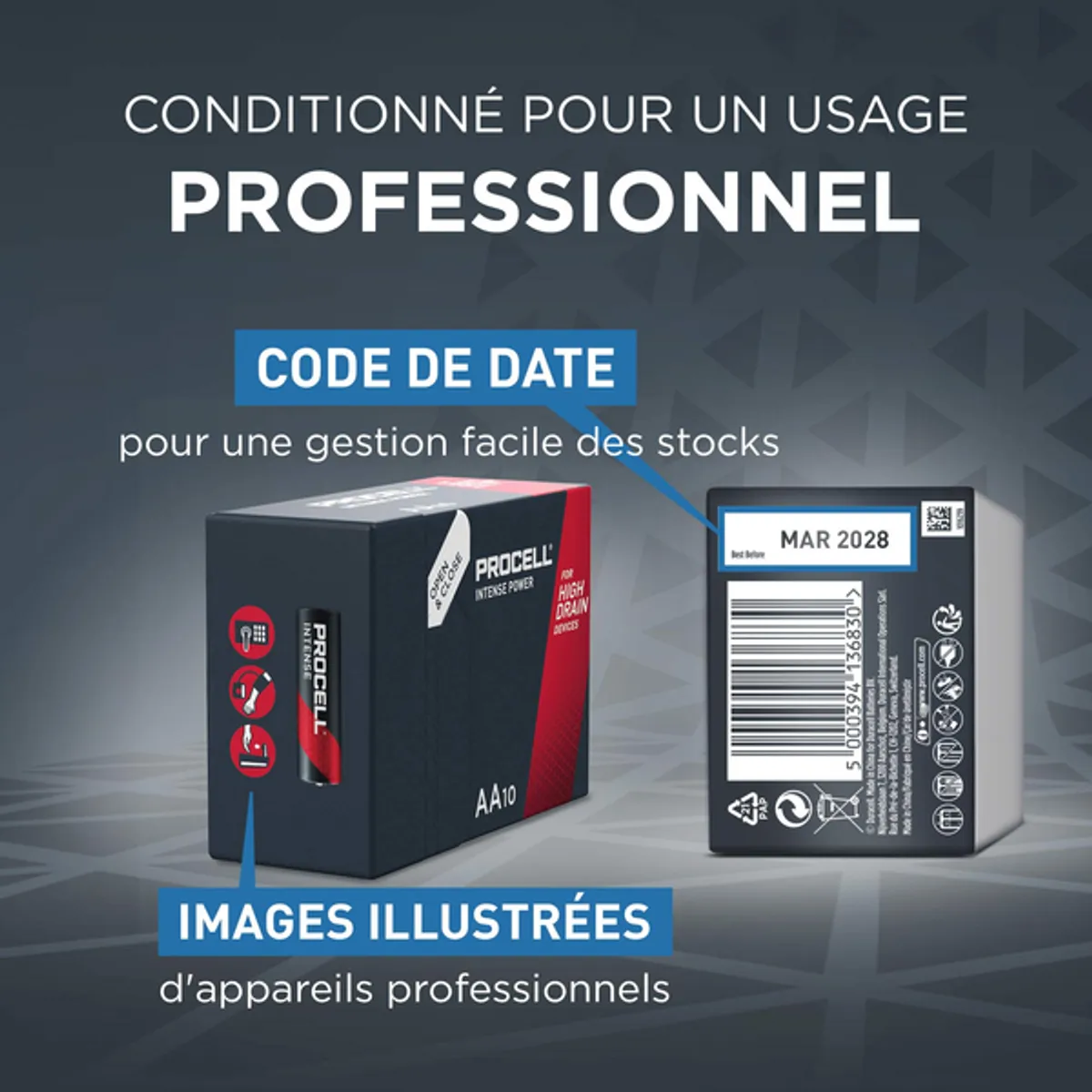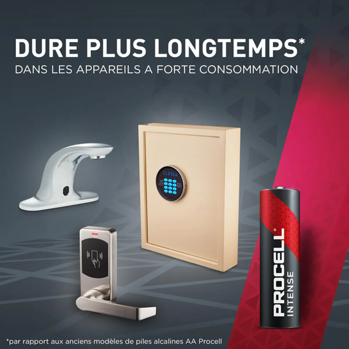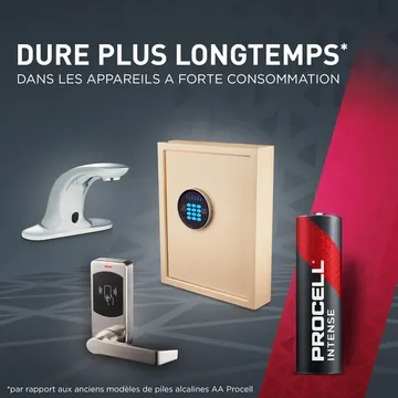 Les piles industrielles alcalines Procell Intense AA sont spécialement conçues pour durer plus longtemps (par rapport aux anciens modèles de piles alcalines AA Procell) dans les appareils professionnels à forte consommation nécessitant une grande énergie ou des pics de puissance, tels que les serrures de porte électroniques, les distributeurs de savon ou les caméras de sécurité.