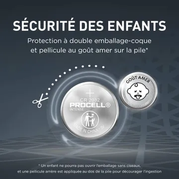 Sécurité des enfants : protection à double emballage-coque afin que les enfants ne puissent pas ouvrir l’emballage sans ciseaux. Une pellicule au goût amer est également appliquée au dos de la pile pour décourager l'ingestion.