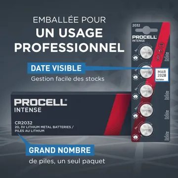 Les piles lithium industrielles Procell bouton Intense 2032 sont conçues pour fournir une alimentation fiable et sûre aux appareils professionnels. Pour éviter que les enfants n’ingèrent accidentellement les produits, Procell a développé une protection à double emballage-coque afin que les enfants ne puissent pas ouvrir l’emballage sans ciseaux. Une pellicule au goût amer est également appliquée au dos de la pile pour décourager l'ingestion. Aussi offerte en format 2025 et 2016.