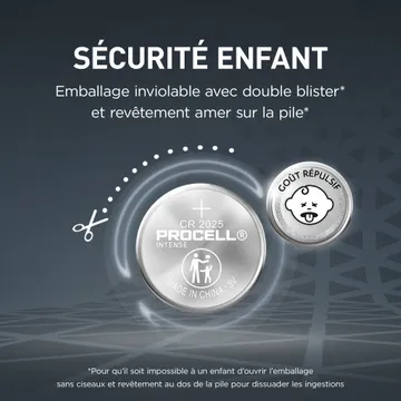 Sécurité enfant : emballage inviolable avec double blister pour qu’il soit impossible à un enfant de l’ouvrir sans ciseaux et revêtement amer appliqué sur le dos de la pile pour dissuader les ingestions
