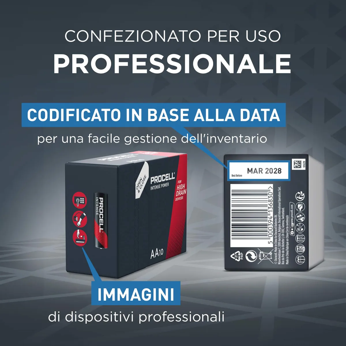 Le batterie alcaline AA industriali Intense sono progettate specificamente per durare più a lungo (rispetto alle precedenti batterie alcaline AA Procell) nei dispositivi professionali ad alto consumo che richiedono un'elevata quantità di energia o picchi di domanda, come le serrature elettroniche delle porte, i dispenser di sapone o le telecamere di sicurezza.