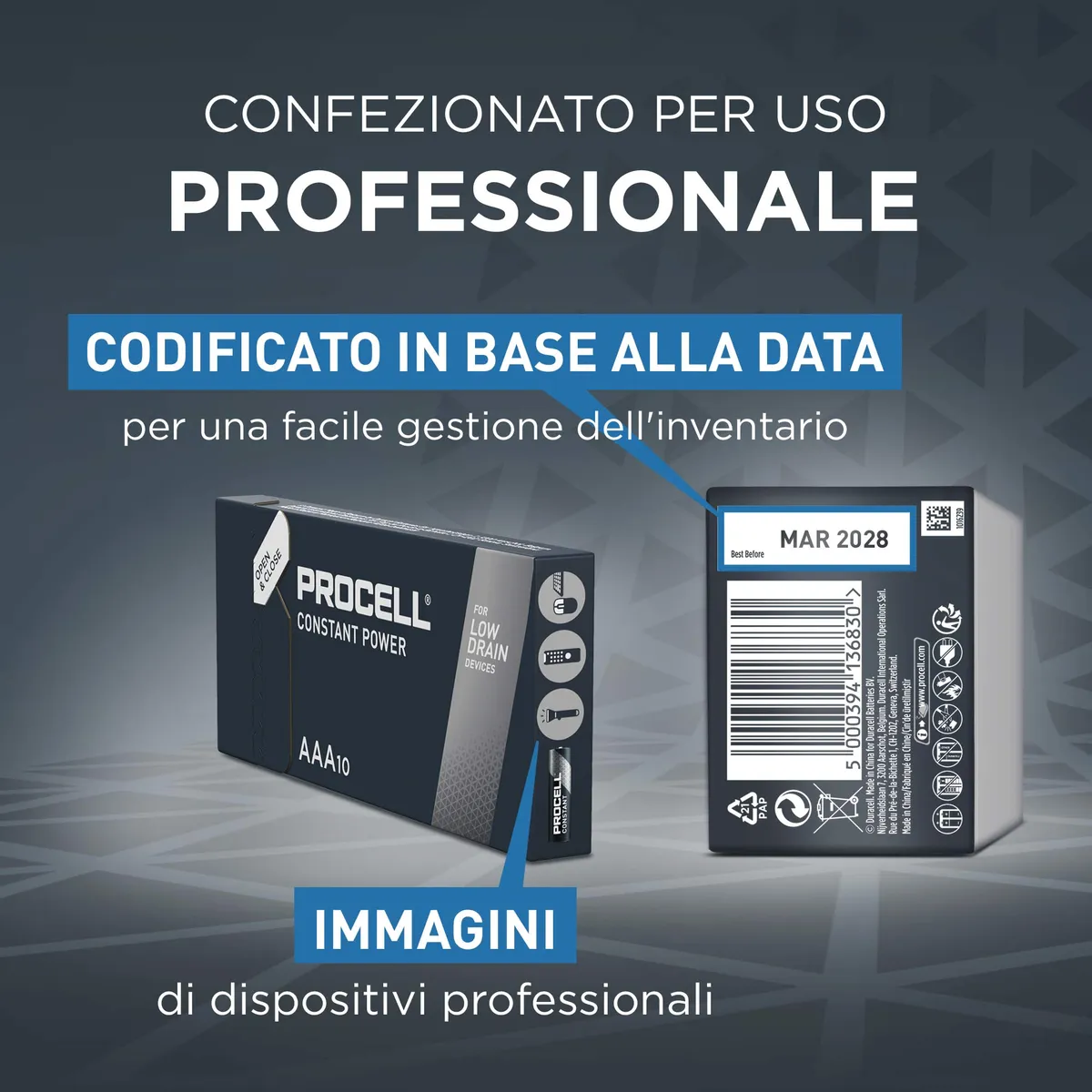 Le batterie alcaline AAA Procell Constant sono ideali per l'utilizzo in dispositivi professionali a basso consumo che richiedono una corrente costante per lunghi periodi di tempo, come tastierini antifurto, telecomandi e glucometri.