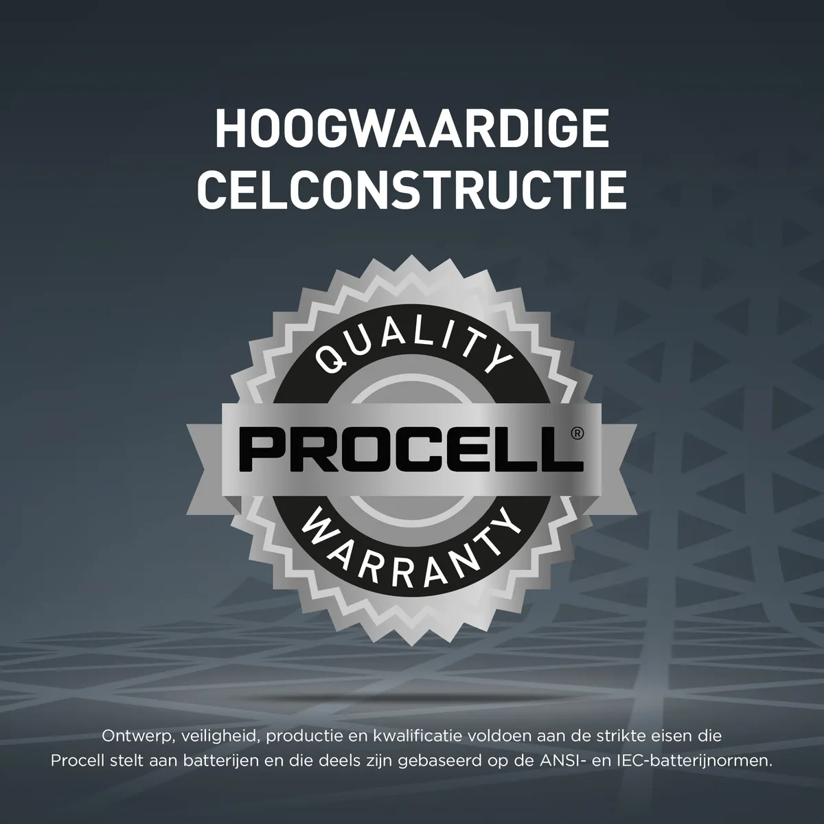 Ontwerp, veiligheid, productie en kwalificatie voldoen aan de strikte eisen die Procell stelt aan batterijen en die deels zijn gebaseerd op de ANSI- en IEC-batterijnormen.