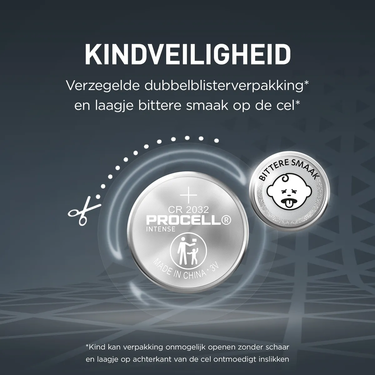 Procell lithium-knoopcel Intense 2032 industriële batterijen zijn ontworpen om betrouwbaar en veilig stroom te leveren aan professionele apparaten. Om te vermijden dat kinderen per ongeluk de batterijen inslikken, ontwikkelde Procell verzegelde dubbelblisterverpakkingen die onmogelijk te openen zijn zonder schaar. Bovendien is een laagje bittere smaak aangebracht op de achterkant van de cel om inslikken te ontmoedigen.