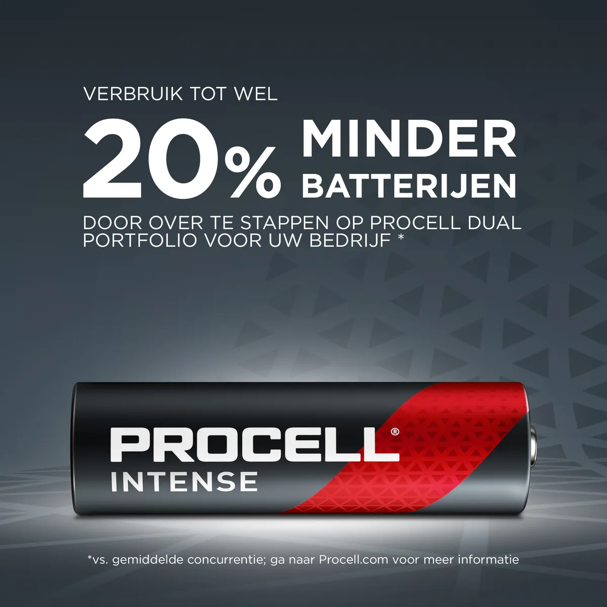 Verbruik tot wel 20% minder batterijen door over te stappen op Procell dual portfolio voor uw bedrijf (vs. gemiddelde concurrentie).