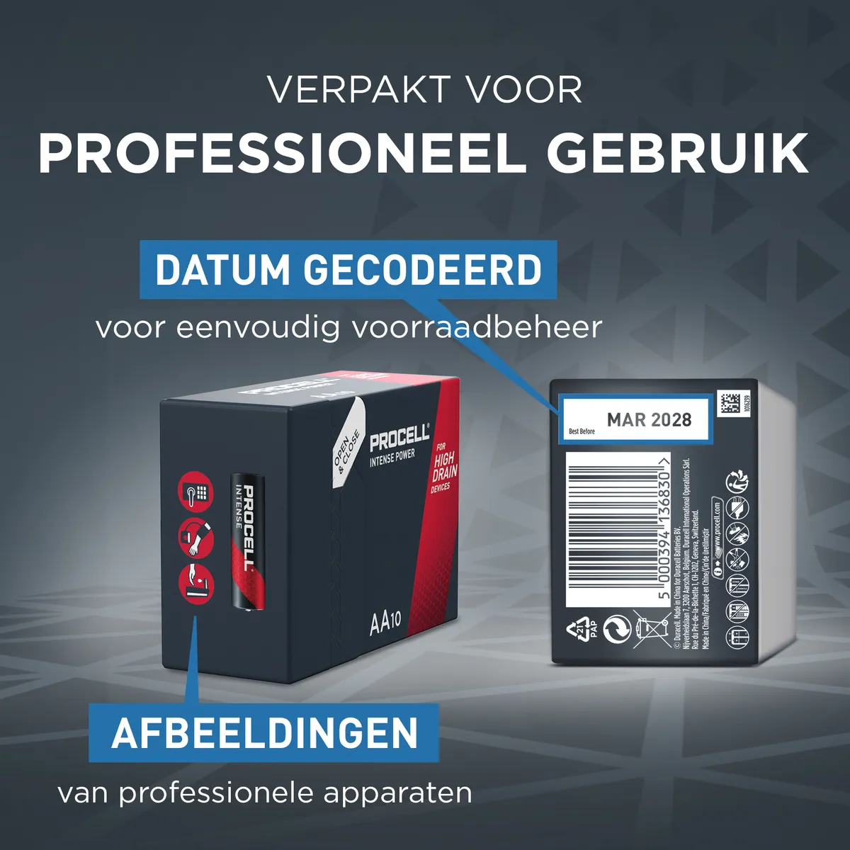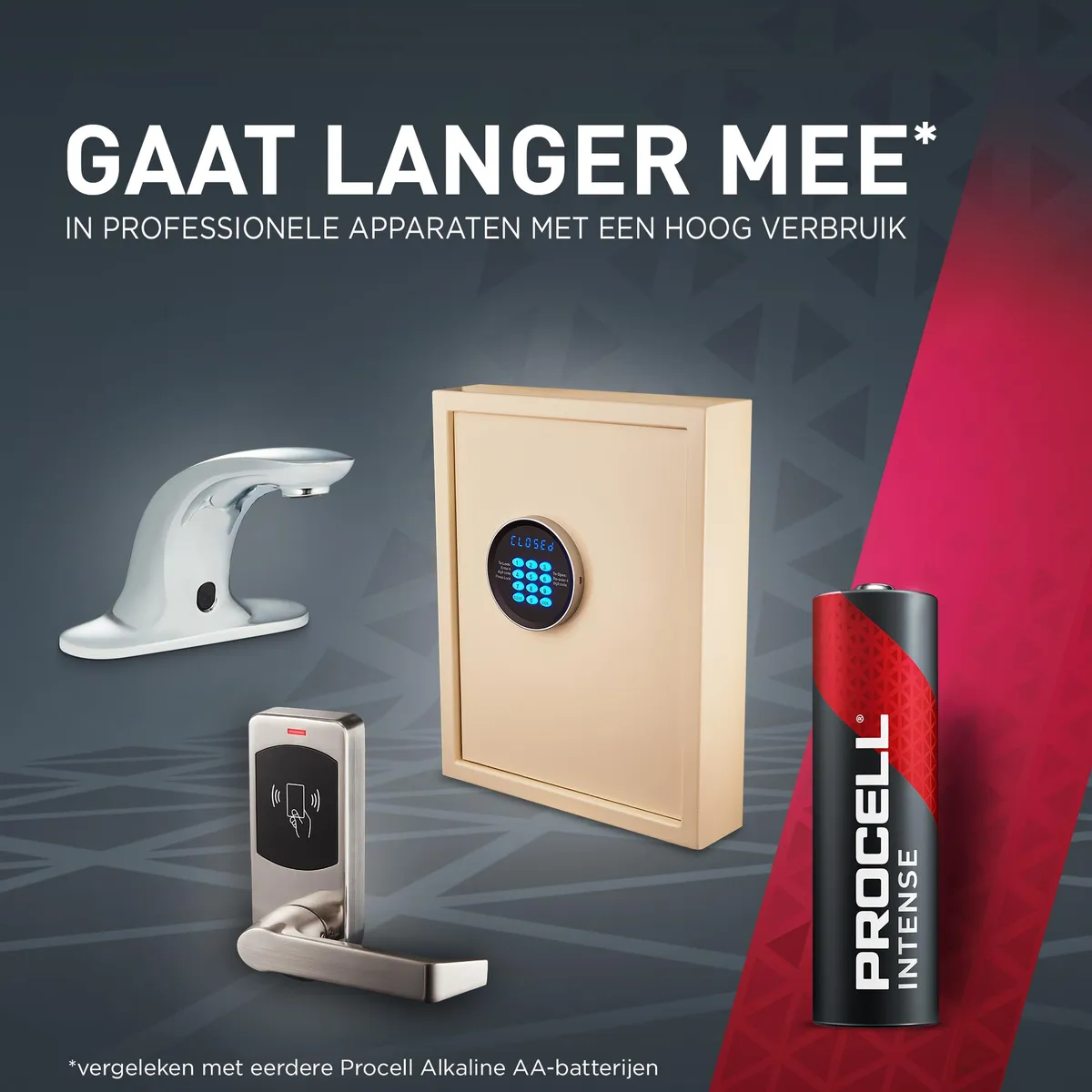 Procell Alkaline Intense AA industriële batterijen zijn speciaal ontworpen om langer mee te gaan (vergeleken met eerdere Procell Alkaline AA-batterijen) in professionele apparaten met een hoog verbruik die veel stroom of piekvermogen vereisen, zoals elektronische deursloten, zeepdispensers of beveiligingscamera's.