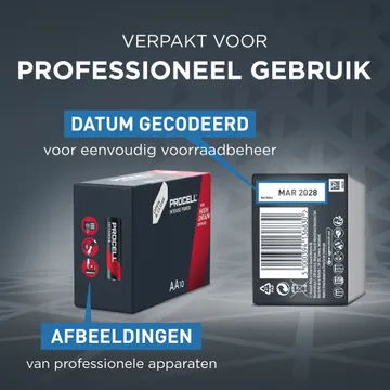 Gaat langer mee (vergeleken met eerdere Procell Alkaline AA-batterijen) in professionele apparaten met een hoog verbruik, wat kan resulteren in minder batterijvervangingen en dus in besparingen op bedrijfskosten die samenhangen met het vervangen van batterijen.