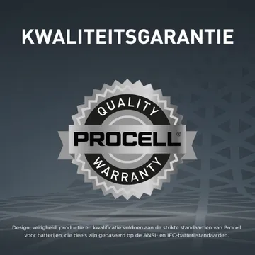 Ontwerp, veiligheid, productie en kwalificatie voldoen aan de strikte eisen die Procell stelt aan batterijen, die deels zijn gebaseerd op de ANSI- en IEC-batterijnormen.