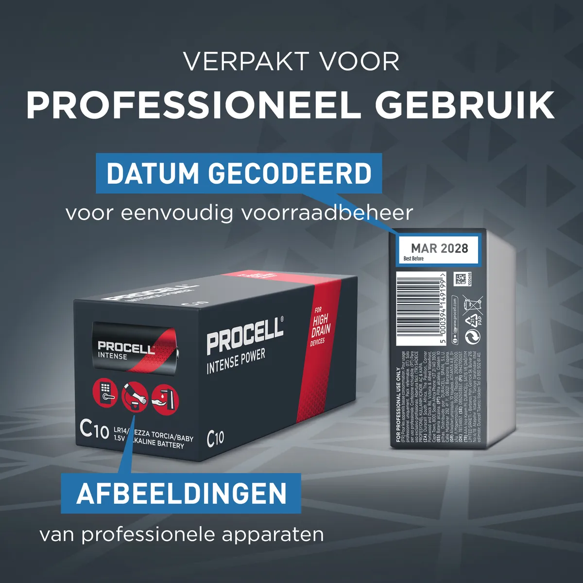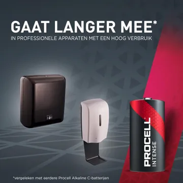 Procell Alkaline Intense C industriële batterijen zijn speciaal ontworpen om langer mee te gaan (vergeleken met eerdere Procell Alkaline C-batterijen) in professionele apparaten met een hoog verbruik die veel stroom of piekvermogen vereisen, zoals zeepdispensers.